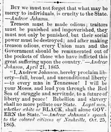 Andrew Johnson made what is remembered as the Moses speech, on October 24, 1864, in Nashville, Tennessee,[41] when he was military governor of Tennessee and a candidate for Vice President on the Lincoln Unionist ticket. "Before an audience of ten thousand colored men...amidst cheers which shook the sky," Johnson proclaimed that he would act for their benefit and advancement as a race now that the slaves of the United States had been emancipated.[42]