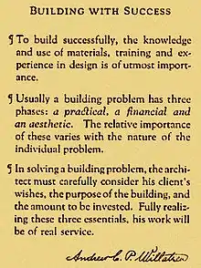 He first worked as a carpenter, then as a draftsman, and arrived at Frank Lloyd Wright's Studio in Oak Park, Illinois in 1902 or 1903.[2] The Studio was just entering its most creative period, and Willatzen soon became a valued apprentice. He later claimed "full responsibility" for Wright's 1905 remodeling of the lobbies of Chicago's Rookery Building, and said that "The Boss" accepted his design for the fence of the Larkin Administration Building (Buffalo, NY, 1907, destroyed) without changes. Willatzen also worked on the interiors of the Martin House in Buffalo and was hired by the Martins for a 1920 remodel, while Wright was away in Japan. He also worked for the Chicago firms of Spencer and Powers and Pond and Pond.[3]