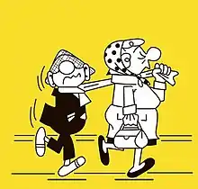 Whenever this happened (also mainly in the earlier strips), the roles are then reversed, with Andy usually confronting Flo for being late from going to bingo and sometimes striking her with either his fist or chasing her out the door with a push broom or a chair with the intent to clobber her with said object.