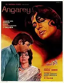 Angarey is a Pakistani film directed by Fareed Ahmed. It stars Shamim Ara, Nadeem, Nisho, Masud Akhtar and Talish in lead roles. It was released on 15 September 1972. The music composition was provided by A. Hameed.[1]