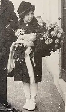 She arrived, with her father, at the North Carolina Executive Mansion in a limousine and, upon exiting the car, ran up the steps to the mansion to hug and kiss the outgoing Governor and First Lady, Thomas Walter Bickett and Fanny Yarborough Bickett.[1] After the meeting at the mansion, she attended the governor's inauguration ceremony at Raleigh Memorial Auditorium, arriving on the arms of her father and Governor Bickett.[1] Harris wore a brown velvet dress, coat and hat with matching kid gloves, and a corsage of sweet peas and lilies of the valley for the occasion.[1] Following the ceremony, her father handed her a bouquet of American Beauty roses that was presented to him by a group of women from Charlotte.[1]