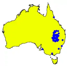 Coolabah apple grows in deep, sandy soils and occurs sporadically in dry areas between Pilliga, Coolabah and Bourke in New South Wales and Cunnamulla, Augathella and St George in Queensland.[2][3][4]