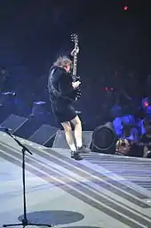 Young was advised by older brother George that, if he ever tripped over his guitar cable, to keep playing and make it look like part of the act.[13] Young also included a sort of striptease as part of a mid-show ritual, during which he slowly took off his schoolboy outfit, running across the stage to elicit cheers from the audience, culminating in a "mooning" gesture to expose his underwear, generally chosen with the colours of the local flag or occasionally offering a brief glimpse of his bare buttocks. He would then pull up his shorts, grab his guitar and play the remainder of the show topless. According to AC/DC video director David Mallet, although Young performs many of his trademark feats sometimes from a series of platforms, risers and ramps, he suffers from a fear of heights; this was discovered when Mallet chose to have Young lowered from a second story balcony onto a stage floor by wires for the video for "Who Made Who".[37]