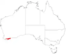 The known distribution range is restricted to a semi-arid area near the south coast of Western Australia, within the Southwest Australia bioregion known as the Esperance Plains.[1] Anigozanthos onycis was described from specimens obtained in sandy heathland between the Stirling Range and Green Range outcrops. It as relatively rare, occurring over a widespread range between the Murchison River and Albany, and extending to Bremer Bay in the east.[2] The species was later found in the Fitzgerald River National Park, emerging after a large bushfire in 1989 and disappearing again in 1991.[3]