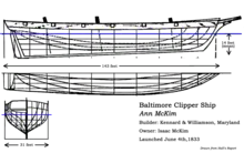 Ann McKim was a Baltimore clipper, measuring 143 feet in length, making her "easily the largest merchantman of her day...and...by far the handsomest."[2] William M. Williamson, a notable authority on sailing ships at the time, described her as "a thing of beauty."[6] She had three sky-sail yards and royal stunsails.[15] Her square raking stern and the heavy after-drag were the common features of Baltimore clippers then. She was also distinguished by her long, easy waterlines with low freeboard and a V-shaped hull.[16] Her length-to-width ratio of over 5:1 corresponded to an extreme clipper. The bow was round in contrast with the sharp bows of the later clippers. Her bow was decorated with a figurehead in a shape of a woman. She had sloping keel—another feature that was not present in true clippers.[17] The frame was made of live oak. The hull was covered with imported red copper, adding $9,000 to her total cost.[2] (The use of copper was probably related to the fact that Isaac McKim Isaac owned a copper rolling and refining mill.[5]) The decks were of teak[18] and her rails, hatch coamings, and skylights were finished with Spanish mahogany. The finest materials used in her construction were personally selected by Captain James Curtis.[2] She also had twelve brass guns mounted on her together with brass capstan heads and bells.[8] The figurehead was design after the wife of the owner, Mrs. Ann McKim.[19]