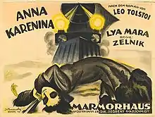 Anna Karenina is a 1920 German silent historical film, directed by Frederic Zelnik and starring Lya Mara, Johannes Riemann, and Heinrich Peer.[1] It is an adaptation of Leo Tolstoy's 1877 novel Anna Karenina. It premiered at the Marmorhaus in Berlin.