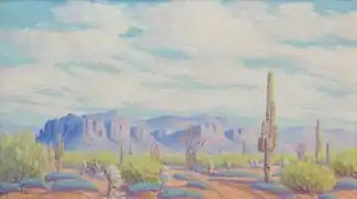 Anna Miller Corbell (1896–1993) was an early 20th century American artist, known for her panoramic landscape paintings of the American Southwest. Corbell was active as a painter for over thirty years. Her subject matter largely consisted of the Southwestern desert with mountain views. Describing herself as "not a modern painter," she worked in a palette of pastel hues to capture the colors and light of the Arizona desert.[1]