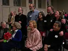 At presentation of 2007 Award. Front row (left to right): Jerry Anderson, Nordic Studies Librarian, founder of the award; Anne Gould Hauberg; Betsy Wilson, Dean of University of Washington Libraries; George Suyama, architect, winner of 2004 award. Second row (left to right): Trimpin, sculptor / musician, winner of 2007 award; Woodruff Sullivan, astronomer (and designer of sundials), winner of 1995 award; Patti Warashina, sculptor, winner of 2005 award; Dennis Evans, multi-media artist and Nancy Mee, glass artist, co-winners of 2002 award.