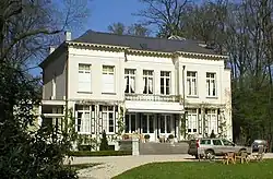 The house lies in the woods of Ulvenhout. A row of beeches line the approach to the estate. Its driveway curves around a lawn where stone steps rise to a small portico. In the back high glass doors open on to a veranda that looks out over gardens and the Brabant countryside. Two ponds are surrounded by wide lawns, tall trees, walking paths and clusters of flowering rhododendrons.[1]