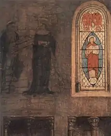 The rear wall has a single stained glass window, where Jehovah stands, above triple plain-glazed windows below, which perhaps suggest the Christian Trinity. On either side of the single window are dim wall-paintings of the Finding of Moses by Pharaoh's daughter (left, pre-figuring the Annunciation itself), and Moses receiving the Ten Commandments (right, paralleling the New Covenant Christ would bring). Below them are roundels with Isaac and Jacob, for which various symbolic functions have been proposed.[11] The lilies are a traditional attribute of Mary, standing for purity. The empty stool may be an "empty throne", a symbol for Christ going back to early Byzantine art.[12]