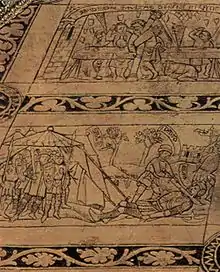 The decoration of the temple is naturally all derived from the Old Testament, but the subjects shown are those believed in the Middle Ages to prefigure the coming of Christ the Messiah. In the floor tiles David's slaying of Goliath (centre front) foretells Christ's triumph over the devil. Behind this, Samson pulls down the Temple of the Philistines, prefiguring both the Crucifixion and the Last Judgement, according to medieval authorities. To the left, Delilah is cutting Samson's hair (Betrayal of Christ), and behind he slays the Philistines (Christ's triumph over sin). The death of Absalom and possibly that of Abimelech are identified by some art historians, although only tiny sections are visible. Erwin Panofsky, who developed much of this analysis, proposed a scheme for the significance of the astrological symbols in the round border tiles, and other versions have been suggested.[10]