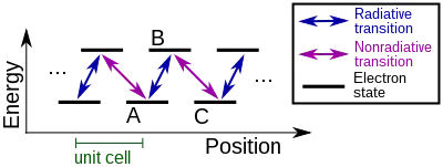Shown at right is an example of a simple system that would exhibit the bulk photovoltaic effect. There are two electronic levels per unit cell, separated by a large energy gap, say 3 eV. The blue arrows indicate radiative transitions, i.e. an electron can absorb a UV photon to go from A to B, or it can emit a UV photon to go from B to A. The purple arrows indicate nonradiative transitions, i.e. an electron can go from B to C by emitting many phonons, or can go from C to B by absorbing many phonons.