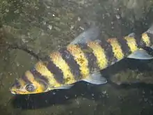 The Anostomidae are a family of ray-finned fishes that belong to the order Characiformes. Closely related to the Chilodontidae and formerly included with them, the Anostomidae contain about 150 described species. Commonly known as anostomids, they are found in freshwater habitats from the Río Atrato in northernmost South America to warm-temperate central Argentina; they are of Amazon origin, with few found west of the Andes (mainly in Colombia and Venezuela). Their scientific name approximately means "mouth on top", from Ancient Greek áno- (ἄνω) "up" (as an adverb) + stóma (στόμᾶ) "mouth", in reference to the arrangement of these fishes' mouth opening.[2]