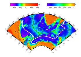 The Vema Channel, a deep trough in the Rio Grande Rise of the South Atlantic at 31°18′S 39°24′W / 31.3°S 39.4°W, is an important conduit for Antarctic Bottom Water and Weddell Sea Bottom Water migrating north.[10] Upon reaching the equator, about one-third of the northward flowing Antarctic bottom water enters the Guiana Basin, mainly through the southern half of the Equatorial Channel at 35°W. The other part recirculates and some of it flows through the Romanche Fracture Zone into the eastern Atlantic.[11]
