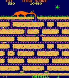 Anteater (The Anteater in Britain, Ameisenbär in Germany) is an arcade video game designed by Chris Oberth and released in 1982 by Tago Electronics.[2] The player steers the tongue of the eponymous creature through a maze, retracting it when dangers approach. Though the arcade game was not a hit, it spawned a number of direct clones for home computers; Sierra's Oils Well became better known than the original. Oberth wrote an Apple II version of his own game for Datamost using a different title.