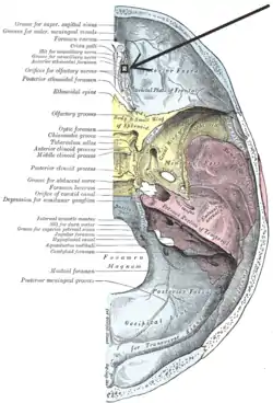 Base of the skull. Upper surface. (On the left, "Anterior ethmoidal foramen" is the 7th label from the right.)