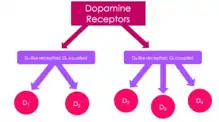 Dopamine receptors are all G protein–coupled receptors, and are divided into two classes based on which G-protein they are coupled to.[2] The D1-like class of dopamine receptors is coupled to Gαs/olf and stimulates adenylate cyclase production, whereas the D2-like class is coupled to Gαi/o and thus inhibits adenylate cyclase production.[2]