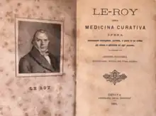 In those years, the Pharmacy started a cooperation with the famous Parisian surgeon Louis Le Roy, author of the treatise Healing Medicine, aka Purgation, translated in Italian for the first time in Bologna in 1824. Although its content was later superseded by improvement in scientific research, the treatise enjoyed a great success at the time and was reprinted several times. A Genoese reprint in 1885 mentioned the cooperation with Sant'Anna's pharmacy in the back cover.[7]