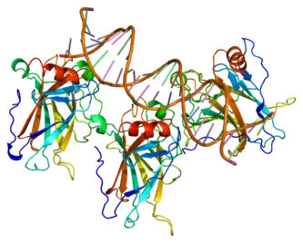 The p53 protein is a tumor-suppressing transcription factor (TF), which can recognize when there is an alteration in a cell's DNA caused by factors including chemical toxins, radiation, ultraviolet (UV) rays, and other damaging agents.[49] Crucially, p53 plays a role in determining whether the damaged genetic material in the cell can be repaired, or if the cell should be destroyed through apoptosis.[50][51] The individual topologically associating domains (TADs) target different genes and unique effector pathways. It has been observed that inactivating both of the TADs detrimentally affects the ability of p53 to suppress tumor growth and interact with target genes. When only one TAD is inactivated, p53 can still suppress specific tumors; however, it can no longer successfully engage in transactivation. The C-terminal domain (CTD) is an intrinsically disordered domain (IDD), which can take on different conformations depending on what it is binding with and is a location of many post-translational modifications, resulting in its ability to regulate p53 function depending on what it is bound to and what modifications are linked with the CTD. This domain also aids in the binding of the central DNA-binding domain (DBD) to specific DNA sequences; the CTD is a positive regulator of DNA binding and stabilizes the interaction of the DNA with the DBD.[49] p53 is unique as a transcription factor in that it can recognize and bind response elements (RE) in many different environments and doesn't need other transcription factors to cooperatively bind with it like many other TFs.[49]