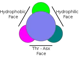 • Type I AFP is found in winter flounder, longhorn sculpin and shorthorn sculpin. It is the best documented AFP because it was the first to have its three-dimensional structure determined.[9] Type I AFP consists of a single, long, amphipathic alpha helix, about 3.3-4.5 kD in size. There are three faces to the 3D structure: the hydrophobic, hydrophilic, and Thr-Asx face.[9]
