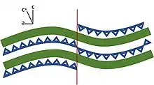 The magnesian serpentines (antigorite, lizardite, chrysotile) are trioctahedral hydrous phyllosilicates. Their structure is based on 1:1 octahedral-tetrahedral layer structures. Antigorite is monoclinic in the space group Pm.[13] Although the magnesian serpentines have similar compositions, they have significantly different crystallographic structures, which are dependent on how the SiO4 tetrahedra sheets fit in with the octahedral sheets.[14] Antigorite's basic composition has a smaller ratio of octahedral to tetrahedral cations (relative to lizardite and chrysotile),[15] allowing the structure to compensate for the misfit of sheets through periodic flipping of the curved tetrahedra layers, and subsequently their polarity.[16] Polysomes of antigorite are defined by the number of individual tetrahedra (denoted as the value m) which span a wavelength of the direction of curvature.[17] The sheets of tetrahedra allow the platy, fibrous crystals to separate parallel to the 001 (basal) plane, giving antigorite its perfect cleavage.