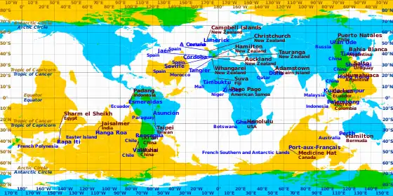 Some cities and towns which are near-antipodes in equirectangular projection. Blue labels pertain to cyan and brown labels pertain to yellow areas. Areas where cyan and yellow overlap (coloured green) are land antipodes.