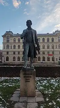 In 1897 Dvořák's daughter Otilie married his student, the composer Josef Suk. In the same year, Dvořák visited Brahms on his deathbed and attended his funeral on 6 April 1897.[96] In November Dvořák was appointed a member of the jury for the Viennese Artists' Stipendium.[97][98] He was informed in November 1898 that Emperor Franz Joseph I of Austria-Hungary would award him a gold medal for Litteris et Artibus, the ceremony taking place before an audience in June 1899.[99] On 4 April 1900 Dvořák conducted his last concert with the Czech Philharmonic, performing Brahms' Tragic Overture, Schubert's "Unfinished" Symphony, Beethoven's 8th Symphony, and Dvořák's own symphonic poem The Wild Dove.[98] In April 1901, The Emperor appointed him a member of the Austrian House of Lords, along with the leading Czech poet Jaroslav Vrchlický.[lower-alpha 4] Dvořák also succeeded Antonín Bennewitz as director of the Prague Conservatory from November 1901 until his death.[101] Dvořák's 60th birthday was celebrated as a national event. First, around the actual date, six of his operas and the oratorio St. Ludmila were performed in Prague, but Dvořák was away in Vienna; then in November 1901 came the "postponed official birthday party... In many towns all over Bohemia and Moravia, the Czech people celebrated his birthday."[102]