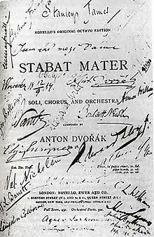 The Stabat Mater, Op. 58, is an extensive (c. 90 minutes) vocal-instrumental sacred work for soli (soprano, alto, tenor and bass), choir and orchestra based on the text of an old church hymn with the same name. The inspiration for creating this piece was the death of the composer's daughter, Josefa.