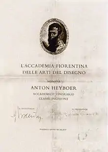 Certificate of "honorary engraver" from the Accademia delle Arti del Disegno, awarded to Anton in 1964.