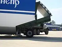 The An-124 is powered by four Lotarev D-18 turbofan engines, each capable of generating up to 238–250 kN of thrust. To reduce the landing distance required, thrust reversers are present.[9] Pilots have stated that the airlifter is relatively light on the controls and is easy to handle for an aircraft of its size.[33] A pair of TA18-200-124 auxiliary power units (APUs) are accommodated within the main landing gear fairings.[9] As a consequence of the heat and blast effects produced by these APUs, some airports require pavement protection to be deployed.[34] The landing gear of the An-124 is outfitted with an oleo strut suspension system for its 24 wheels. This suspension has been calibrated to allow for landing on rough terrain and is able to kneel, which allows for easier loading and unloading via the front cargo door.[29][9] Other features intended to ease loading including an onboard overhead crane in the cargo deck, capable of lifting up to 30 tonnes, while items up to 120 tonnes can be winched on board.[35][9] Two separate radar units are typically present, one is intended for ground mapping and navigation purposes, while the other is for weather.[9]