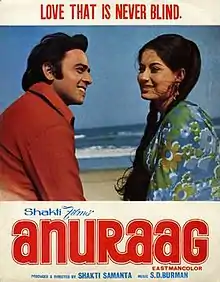 Anuraag is a 1972 Indian Hindi-language drama film, directed by Shakti Samanta. The film stars Moushumi Chatterjee in her debut as a heroine and Vinod Mehra in lead roles. The Shakti Samanta fixture Rajesh Khanna, having earlier made Aradhana (1969) and Kati Patang with Samanta, makes a special appearance. The music is by S. D. Burman. Initially, Shakti Samanta was thinking whether to make this film or not as he was not sure if the distributors would buy a film with such a story line and had shared the idea with Rajesh Khanna, who encouraged Samanta and volunteered to make an extended appearance for the film, and also distributed the film under the banner "Shakti-Raj" (indicating Shakti Samanta and Rajesh Khanna).[1]