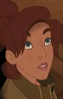 According to his notes, Bluth felt the character's eyes were originally drawn too close together, in addition to finding her hair too red and boots too large.[34][35][36] Writing for Animated Views, Ben Simon observed that some early drawings conveyed a "softer and more visually appealing version" of the heroine.[21] Other early iterations included a T-shirt and baggy men's trousers inspired by actress Marlene Dietrich.[37] Bluth designed Anya based on actresses Audrey Hepburn and Julia Roberts.[19][38][39] According to character designer Len Simon, Anya "physically looks like a princess, but has a more common way of behaving, as she doesn't remember that she belongs to a royal family".[39] Some of Bluth's drawings of Anya were exhibited at the Savannah College of Art and Design in 2017.[32]