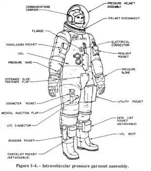 The Apollo/Skylab space suit (sometimes called the Apollo 11 Spacesuit due to the fact that it was most known for being used in the Apollo 11 Mission) is a class of space suits used in Apollo and Skylab missions. The names for both the Apollo and Skylab space suits were Extravehicular Mobility Unit (EMU).[2] The Apollo EMUs consisted of a Pressure Suit Assembly (PSA) aka "suit" and a Portable Life Support System (PLSS) that was more commonly called the "backpack".[3] The A7L was the PSA model used on the Apollo 7 through 14 missions.[4]
