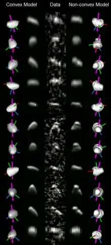 Comparison between the best-fit convex and nonconvex shape models, and some of the available radar images of (99942) Apophis