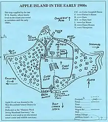 Apple Island is a 37-acre (150,000 m2) island, spanning three-eighths of a mile in length and a quarter of a mile in width.[2] The island's highest point is 960 feet (290 m) in elevation, approximately 31 feet (9.4 m) above the normal elevation of Orchard Lake.[3] The island's formation traces back to the recession of the region's last ice age glacier 10,000 to 12,000 years ago.