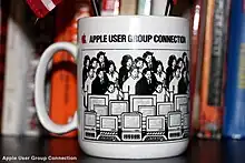 Ellen Petry Leanse guided the design of this vintage Apple mug, working with Apple's Creative Services team. She states, "It would not meet Apple design standards today but it sure worked at the time." The "Thanks" is a tribute to the advisory council Ellen Petry brought together to talk with Apple about ways of working with User Groups at the time.