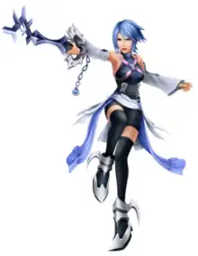 Aqua (Japanese: アクア, Hepburn: Akua) is a character from Square Enix's video game franchise Kingdom Hearts. First making cameo appearances in Kingdom Hearts II and its updated version Final Mix, she is introduced in the prequel Kingdom Hearts Birth by Sleep alongside her friends Terra and Ventus. The three are Keyblade apprentices training under Master Eraqus, and are the playable protagonists. As the only one among her friends to obtain the rank of Keyblade Master, Aqua is assigned to monitor Terra and Ventus as she combats dark creatures known as the Unversed.