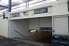 There is an additional unstaffed fare control area at the north end of Rockaway-bound platform. Two HEET platform-level turnstiles lead to a staircase that goes down to a pedestrian tunnel that runs underneath the line. This exits to Hawtree Street (near 99th Place and Cohancy Street).[11] There is a Resorts World Casino shuttle bus stop at the street exit, providing service to Aqueduct Racetrack and the casino. Until August 2013, this was exit-only, with a still-standing chain link fence that was locked when it was closed, with signs that had informed people that there is no subway entrance in the tunnel. The portal is now available for both entrance and exit at all times, including casino off hours. Newer signage advises that the entrance provides access to the southbound platform, and to walk the platform to the south mezzanine for northbound service toward Manhattan.