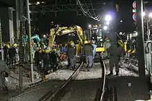 On 12 February 2013, at around 15:50, a non-stop 6-car limited express service bound for Umeda collided with the rear end of a truck which had not completely cleared the level crossing to the west of the station. The first two cars of the train derailed and slid 170 m before hitting the edge of the station platform and coming to rest. 15 people were injured in the collision, including the train driver and truck driver.[3][4]