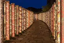 Arashiyama Station (嵐山駅, Arashiyama-eki) is a tram stop in Ukyo-ku, Kyoto, Japan,[3] and the western terminus of the Randen Arashiyama Line that begins at Shijō-Ōmiya. The station includes a small shopping arcade, outdoor eating areas, a foot bath, a garden featuring cherry and maple trees, as well as the "Kimono Forest," a collection of 600 kimono gowns wrapped around poles with LED lighting inside[4][5] developed by the interior designer Yasumichi Morita.
