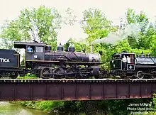 Arcade & Attica #18. - Arcade & Attica 18: (2-8-0) - Built in 1920 American Locomotive Company at its 'Cooke Works' in Paterson, New Jersey.[2] Currently out of service undergoing a full rebuild in Syracuse, NY, with reassembly scheduled to begin in Fall of 2024(?) The running gear returned from a full overhaul in 2022, however the boiler work has yet to be completed.The cab and tender can be seen tucked behind #111 in front of the shop, while the chassis/running gear remains out of the elements inside the shop. This locomotive was acquired in 1962 from the Boyne City Railroad in Michigan. Due to lower water capacity and a crack in the frame, #18's original tender now sits in the weeds off next to the shed, rusted away.14's tender was also modified after 1988 to have even more water capacity to help #18 with its excursions.[3]