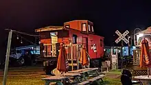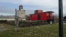 Caboose 304 sits next to the ice cream caboose, while the Agway grain elevator looms in the background