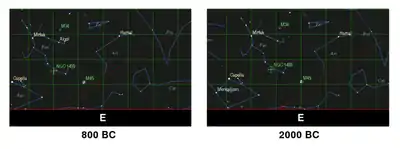 The Shatapatha Brahmana mentions that the Krttikas (the Pleiades) "do not swerve from the east".[9][10] This would have been the case with precision at 2950 BCE[8] and was true also about 2000 BCE,[11] but was still true to within 8-13 degrees (viz., East by north) around the 8th to 6th centuries BCE, the assumed date of the text's composition.[12]