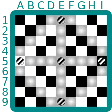 A piece's powers are affected by the square on which the battle takes place, with each player having an advantage on squares of their own color.[1]: 3 Each quadrant of sixteen squares (e.g., A1:D4) in each corner of the board has six dark squares, six light squares, and four oscillating squares which cycle between light and dark, making them dangerous to hold over time; these quadrants are separated by oscillating squares along the middle column (E) and row (5). In total, 27 squares on the board (1⁄3) oscillate between light and dark.
