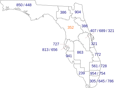 Florida area codes: 239, 305/786, 321, 352, 386, 407/689, 561, 727, 772, 813, 850/448, 863, 904, 941, 954/754