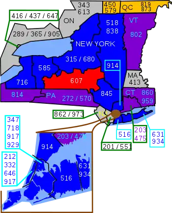 Area code 607 is a telephone area code in the North American Numbering Plan for the U.S. state of New York. It serves parts of its Southern Tier (which borders Pennsylvania). It was created in 1954 by combining the southern portion of 315 and the eastern portion of 716.[1] Initially, in the late 1940s, area codes with a middle digit of "0" (x0x-xxx-xxxx) were assigned only to jurisdictions covering an entire state. Along with 507 in Minnesota and 606 in Kentucky, 607 was among the first such area codes to be added to a jurisdiction.