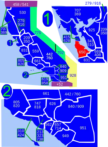 | West: Pacific Ocean, 808 | area code 650 | East: 510/341, 925 |