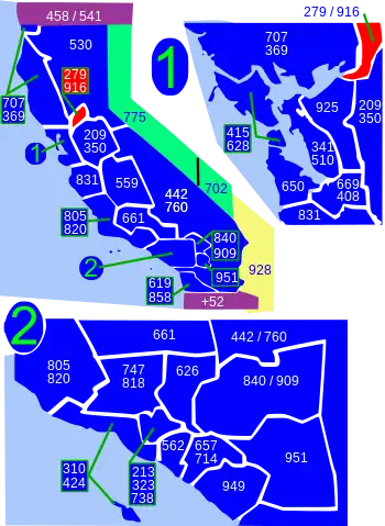 California area codes: 209, 213/323, 279/916, 310/424, 341/510, 408/669, 415/628, 442/760, 530, 559, 562, 619/858, 626, 650, 657/714, 661, 707, 747/818, 805/820, 831, 840/909, 925, 949, 951