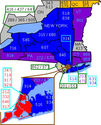 New York area codes: 212/332/646, 315/680, 347/718/929, 363/516, 518/838, 585, 607, 631/934, 624/716, 329/845, 914, 917