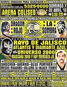 On April 7, 2013, CMLL celebrated the Arena Coliseo's 70th Anniversary Show with a special professional wrestling event that featured a number of veteran wrestlers that did not usually work for CMLL such as Negro Navarro, Black Terry, Villano IV, Ray Mendoza, Jr., Universo 2000, Máscara Año 2000, and Rayo de Jalisco, Jr. working with a number of CMLL wrestlers. The main event of the show saw Dragón Rojo, Jr. defend the CMLL World Middleweight Championship against NWA World Historic Welterweight Champion La Sombra. The event commemorated the completion of Arena Coliseo on April 2, 1943, built by CMLL owner and founder Salvador Lutteroth. The show aired live on the Mexican television channel Terra.[1]